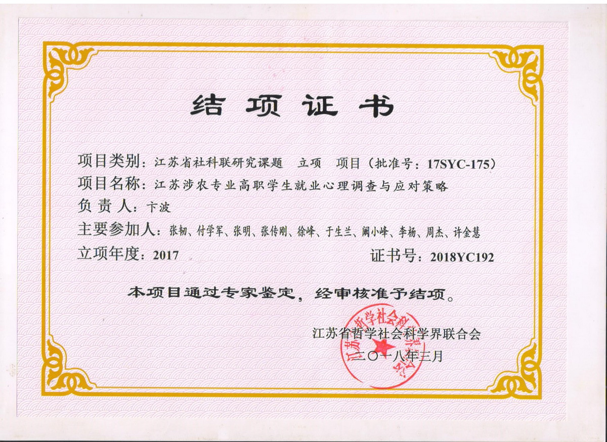 近日,接江苏省社科联通知,我院卞波老师主持的《江苏涉农专业高职学生就业心理调查与应对策略》课题经专家组评审,顺利结题。该课题深入挖掘高职院校涉农专业学生的就业意向、就业目标、就业心理和就业动机等,对就业创业教育方法进行了深化研究,该课题的圆满结题,体现了我院教师精益求精的科学态度和持之以恒的探索精神,对我院新一轮课题研究起到了引领促进作用。