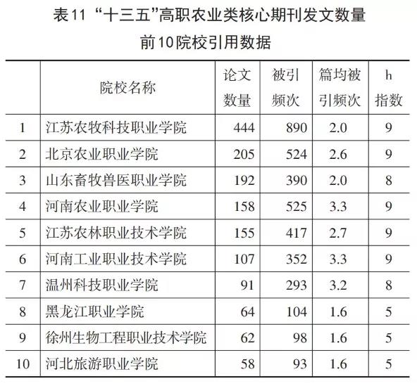 排名前十位的高职院校是江苏农牧科技职业学院、北京农业职业学院、山东畜牧兽医职业学院、河南农业职业学院、江苏农林职业技术学院、河南工业职业技术学院、温州科技职业学院、黑龙江职业学院及河北旅游职业学院。其中“双高”建设院校7所,表明我校涉农科研生产力、影响力直逼“双高”方阵。