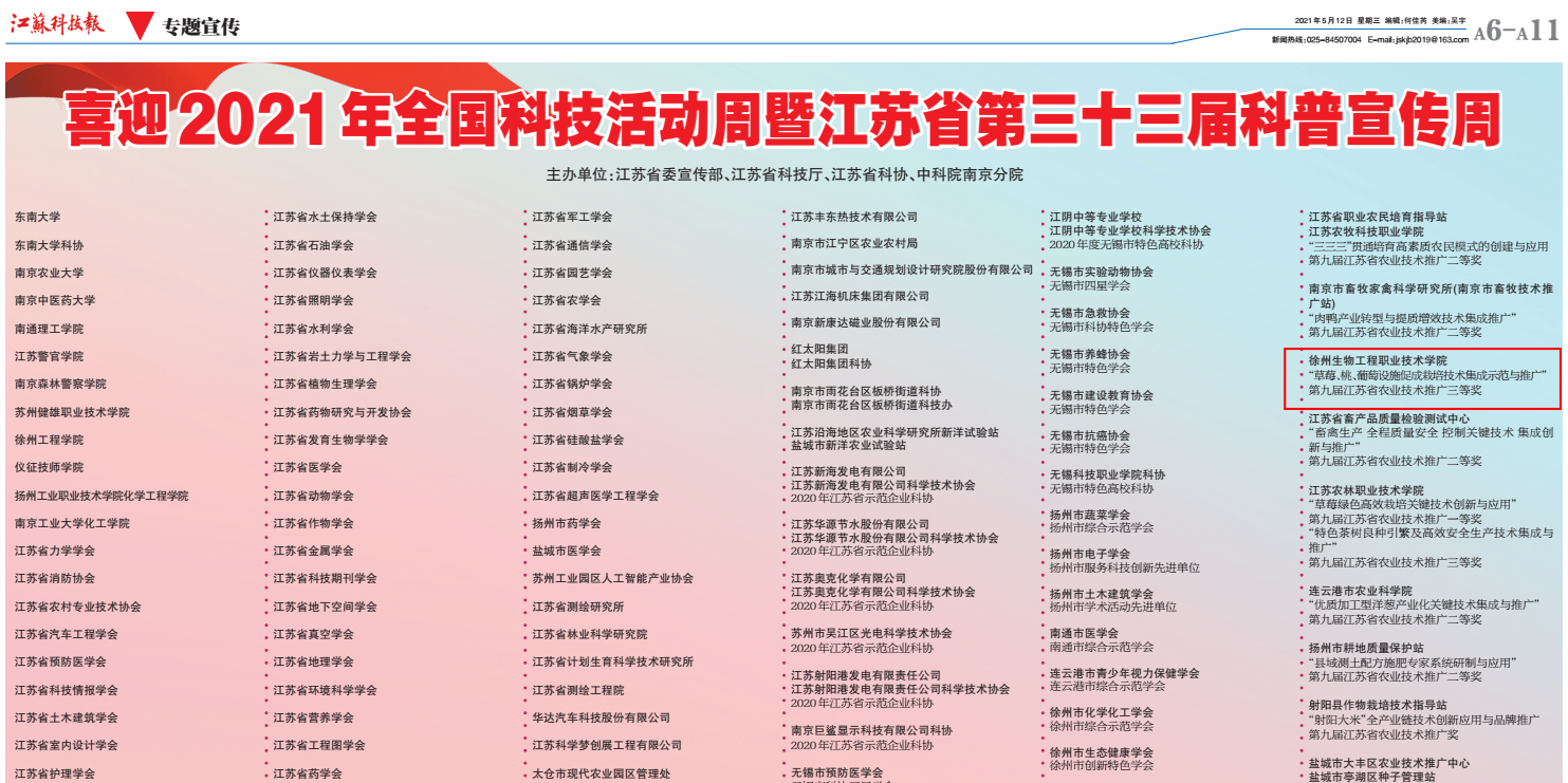 5月12日,《江苏科技报》在A11版喜迎2021全国科技活动周暨江苏省第三十三届科普宣传周栏目,刊发农林工程学院强承魁教授牵头的“草莓、桃、葡萄设施促成栽培技术集成示范与推广”项目喜获第九届江苏省农业技术推广三等奖。