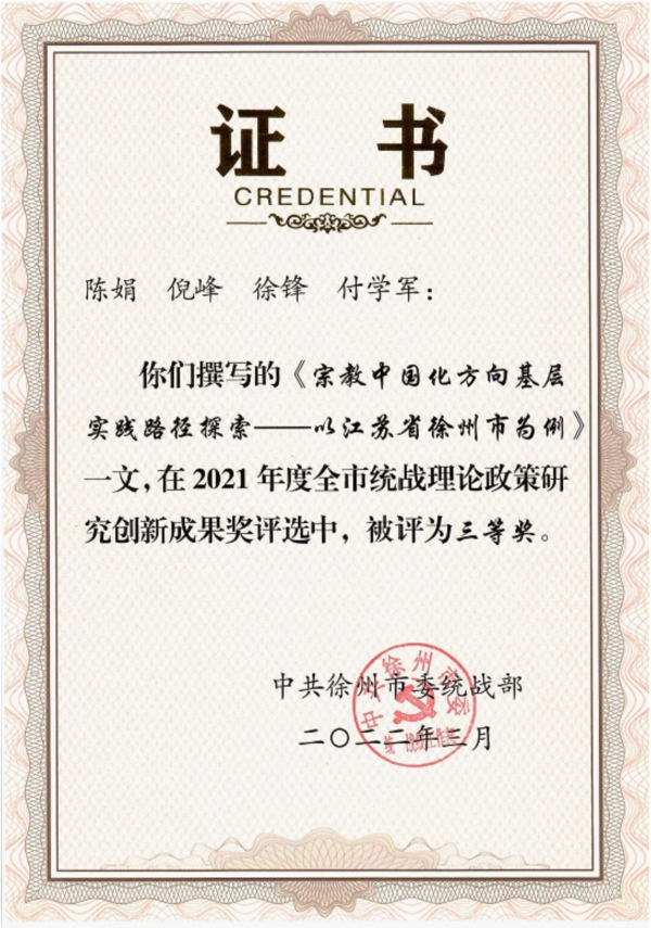 据悉,该成果由陈娟、倪峰、徐锋、付学军共同完成,成果源于徐州市社会科学基金资助项目统战理论政策研究专项课题,并获资助经费2000元。这也是我校首次获评统战领域社科项目及创新成果奖。
