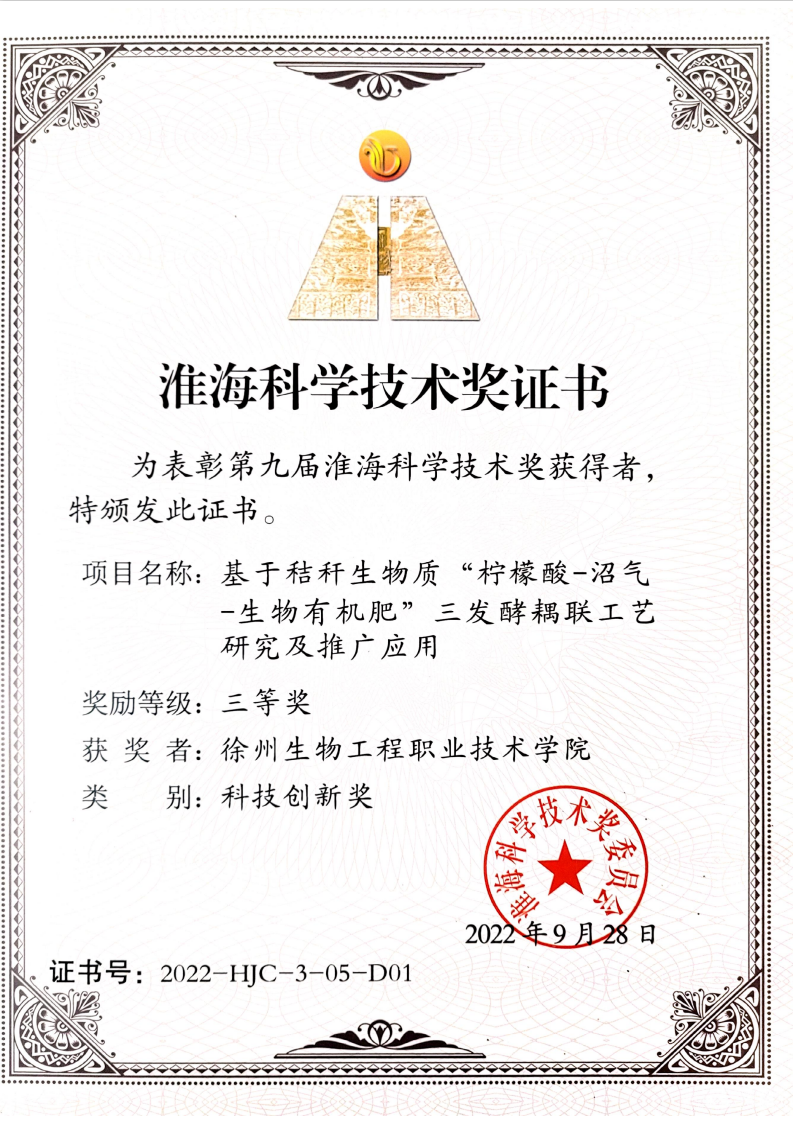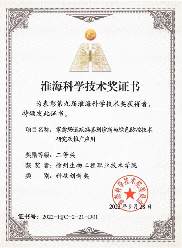动物工程学院张林吉团队的《家禽肠道疾病鉴别诊断与绿色防控技术研究及推广应用》项目获第九届淮海科学技术奖二等奖,药品食品学院孙科团队的《基于秸秆生物质“柠檬酸—沼气—生物有机肥”三发酵偶联工艺研究及推广应用》项目获第九届淮海科学技术奖三等奖。