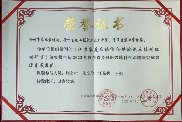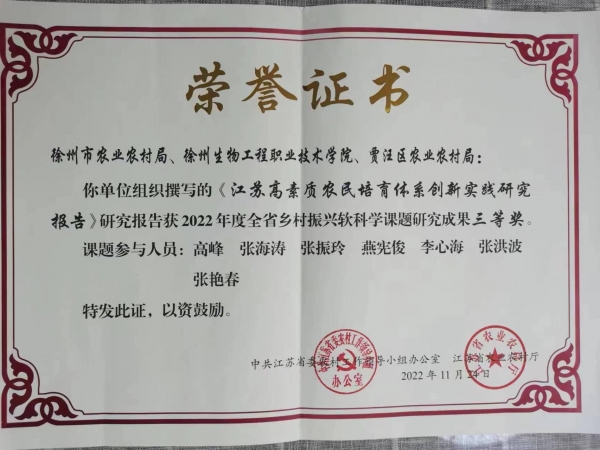 动物工程学院高峰联合徐州市农业农村局、贾汪区农业农村局提交的研究成果“江苏高素质农民培育体系创新实践研究”获评三等奖。基础部周奎生团队联合徐州市农业农村局、贾汪区农业农村局提交的研究成果“江苏家庭农场综合保险试点体制机制研究”获优秀成果奖。