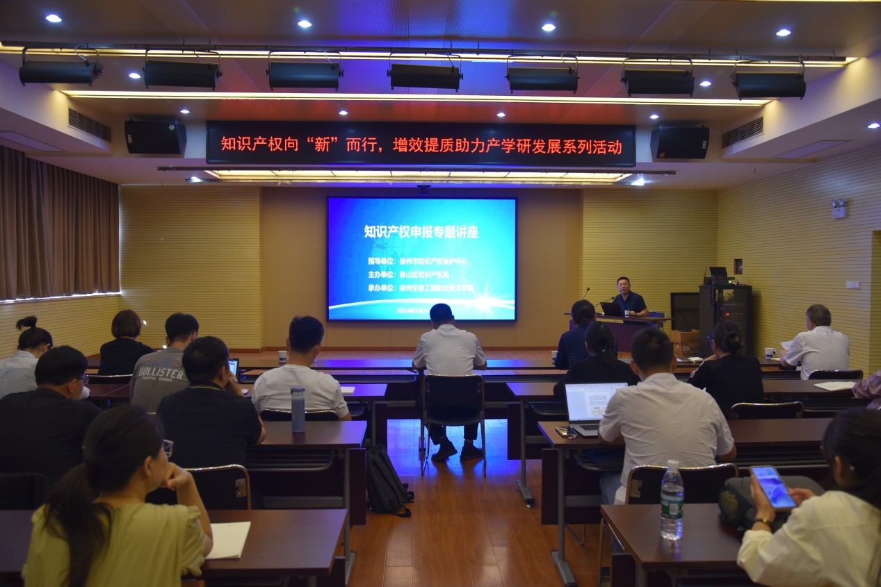 创新是引领发展的第一动力,保护知识产权就是保护创新。为深入贯彻落实习近平总书记关于知识产权工作的重要指示重要论述精神,加快知识产权强市建设,9月24日上午,由徐州市知识产权保护中心指导、泉山区知识产权局主办、我校承办的知识产权申报专题讲座在泉山校区视频会议室举办。学校党委委员、副校长强承魁,各二级学院分管副院长、教师代表等五十多位教师参加会议。会议由科研处处长史先振主持。