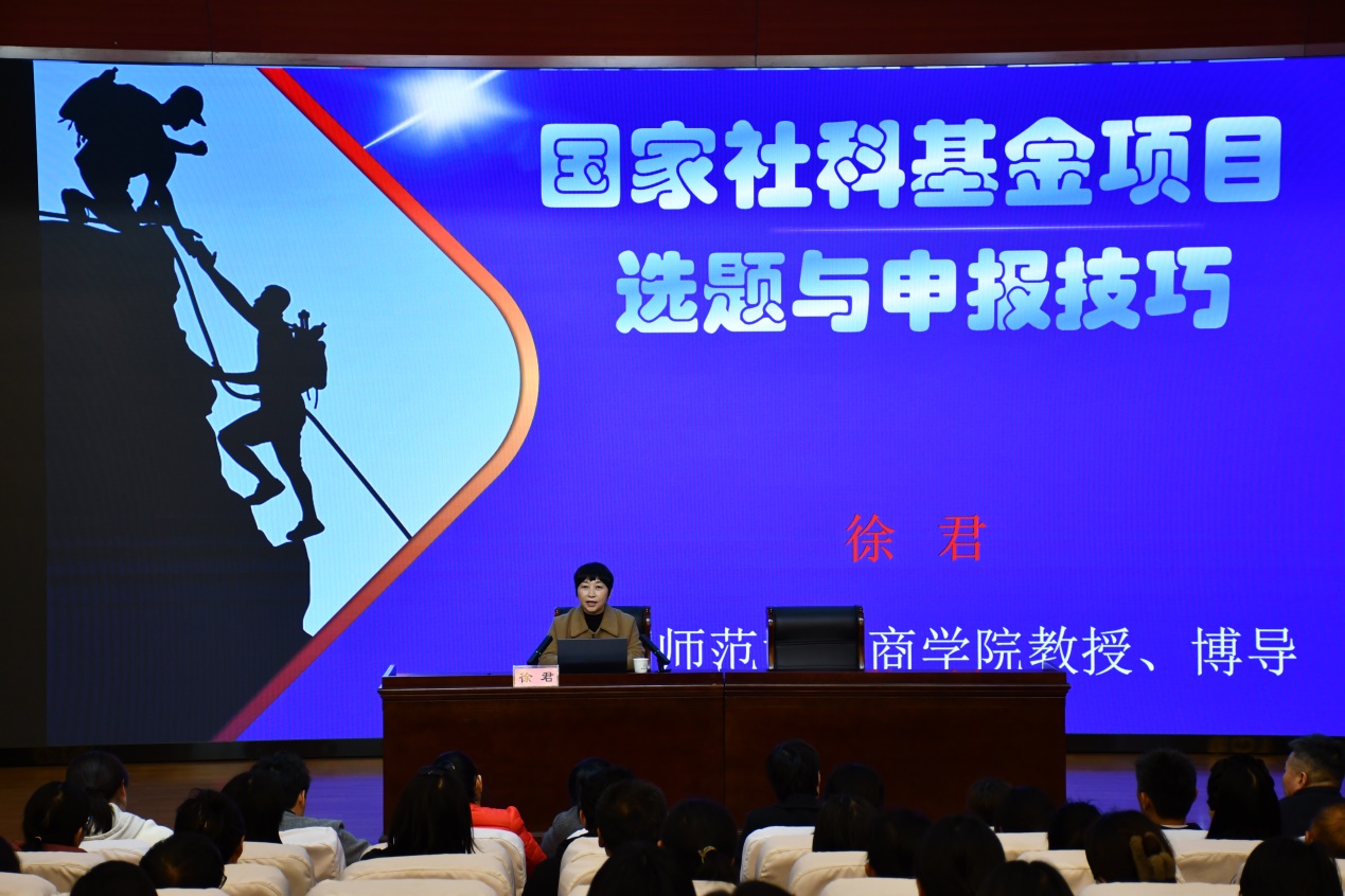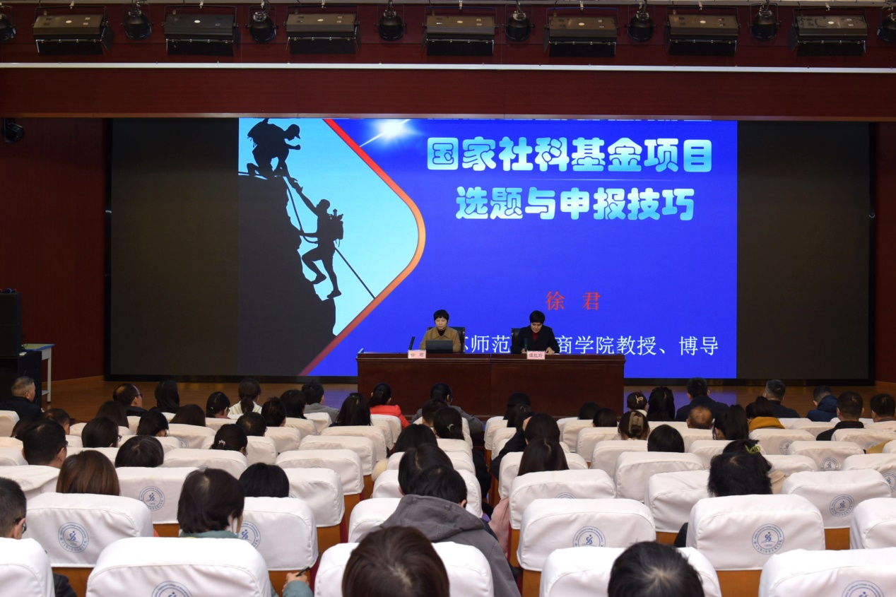 为进一步提升我校社科基金项目培育和申报质量,不断增强申报项目的竞争力,持续提升我校教师的科研能力和实践经验,11月26日,学校邀请了江苏师范大学徐君教授为我校教师开展了《国家社科基金项目选题与申报技巧》的专题讲座。各学院书记、院长及近年来主持或参与人文社科项目的相关教师参加了本次学术活动。讲座由校党委委员、副书记谭红玲主持。